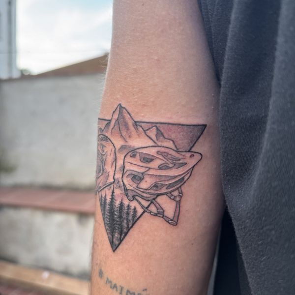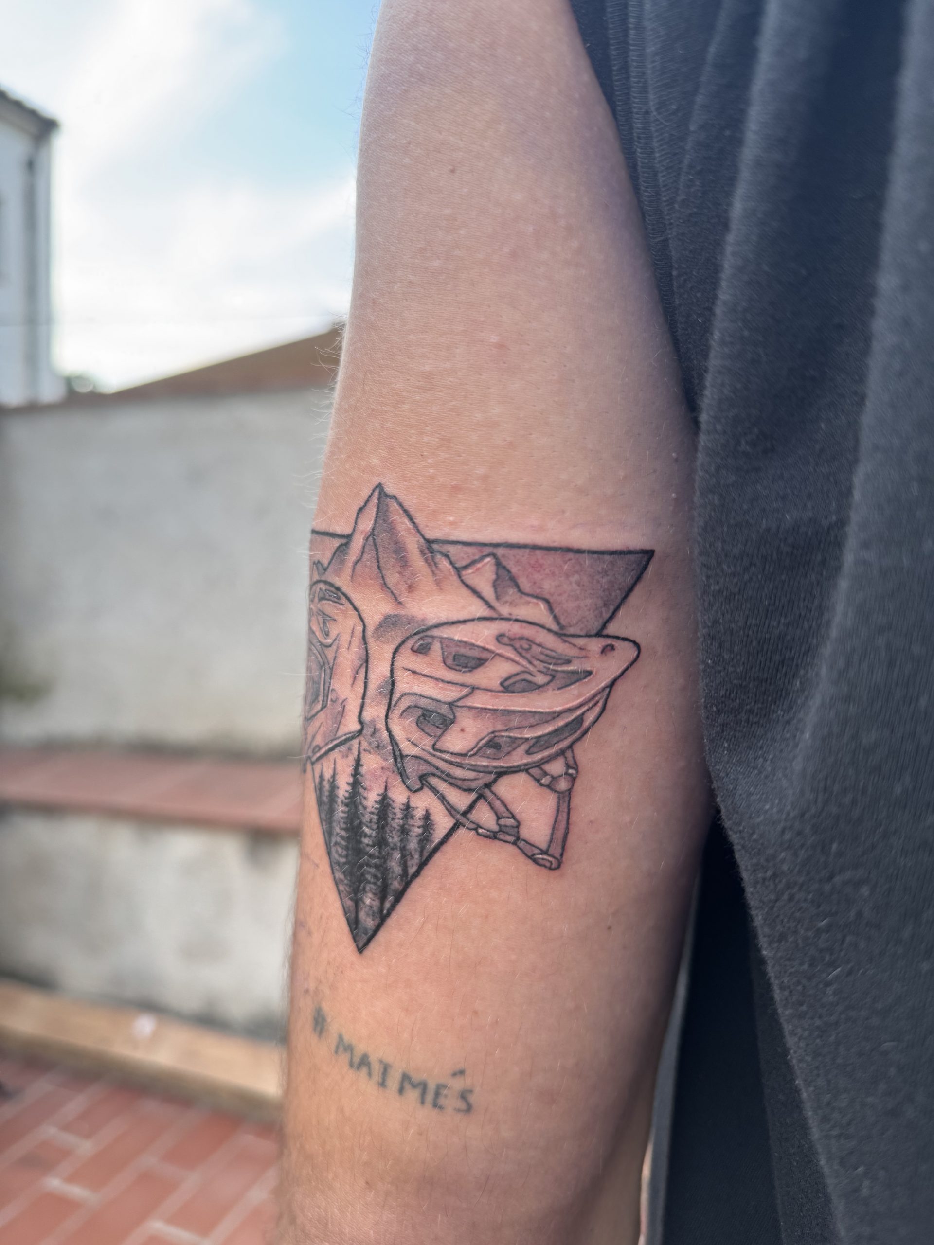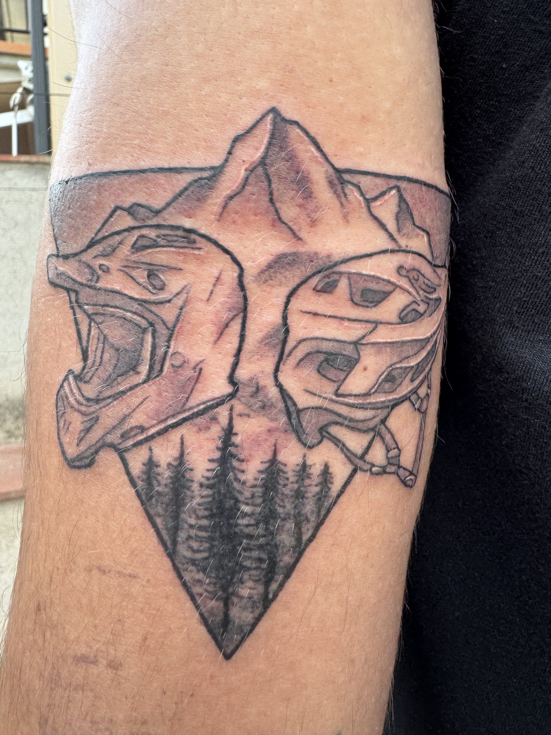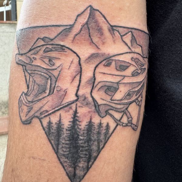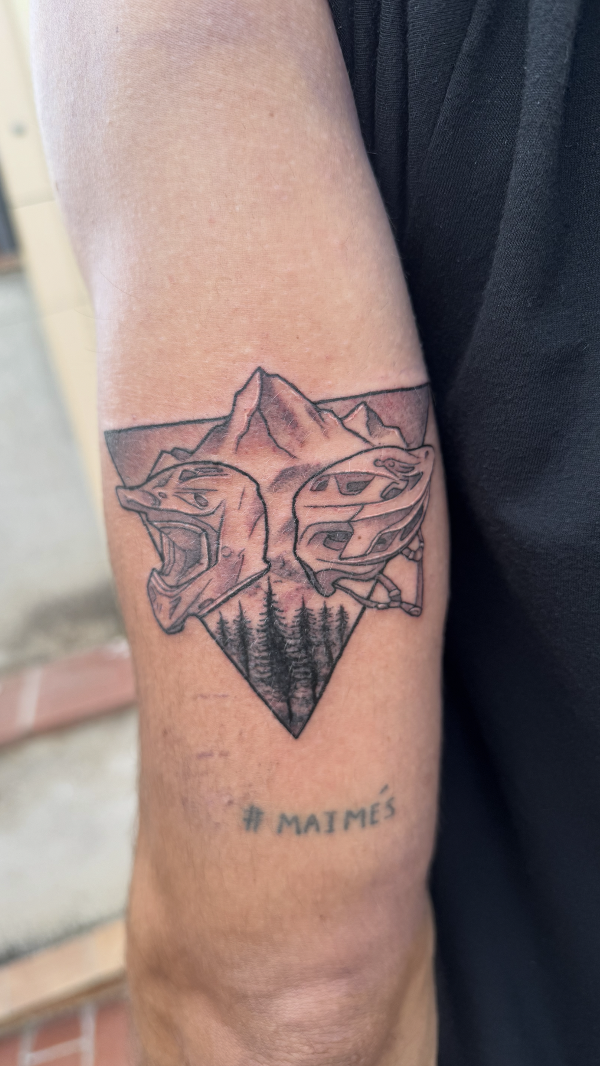 Tatuatge de dues passions unides per la muntanya. Un casc per representar la passió per la bicicleta mtb i l’altre casc per representar la passió per la moto d’enduro. Un tatuatge que plasma l’esperit de naturalesa salvatge, llibertat i esport.