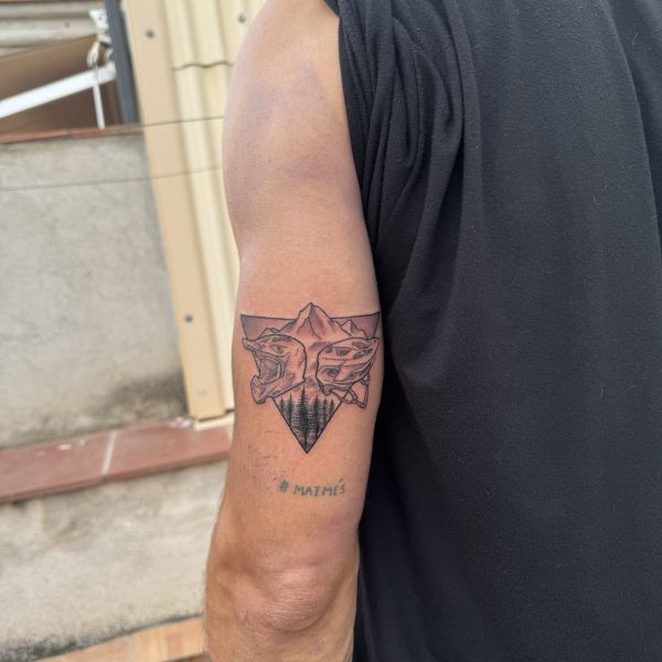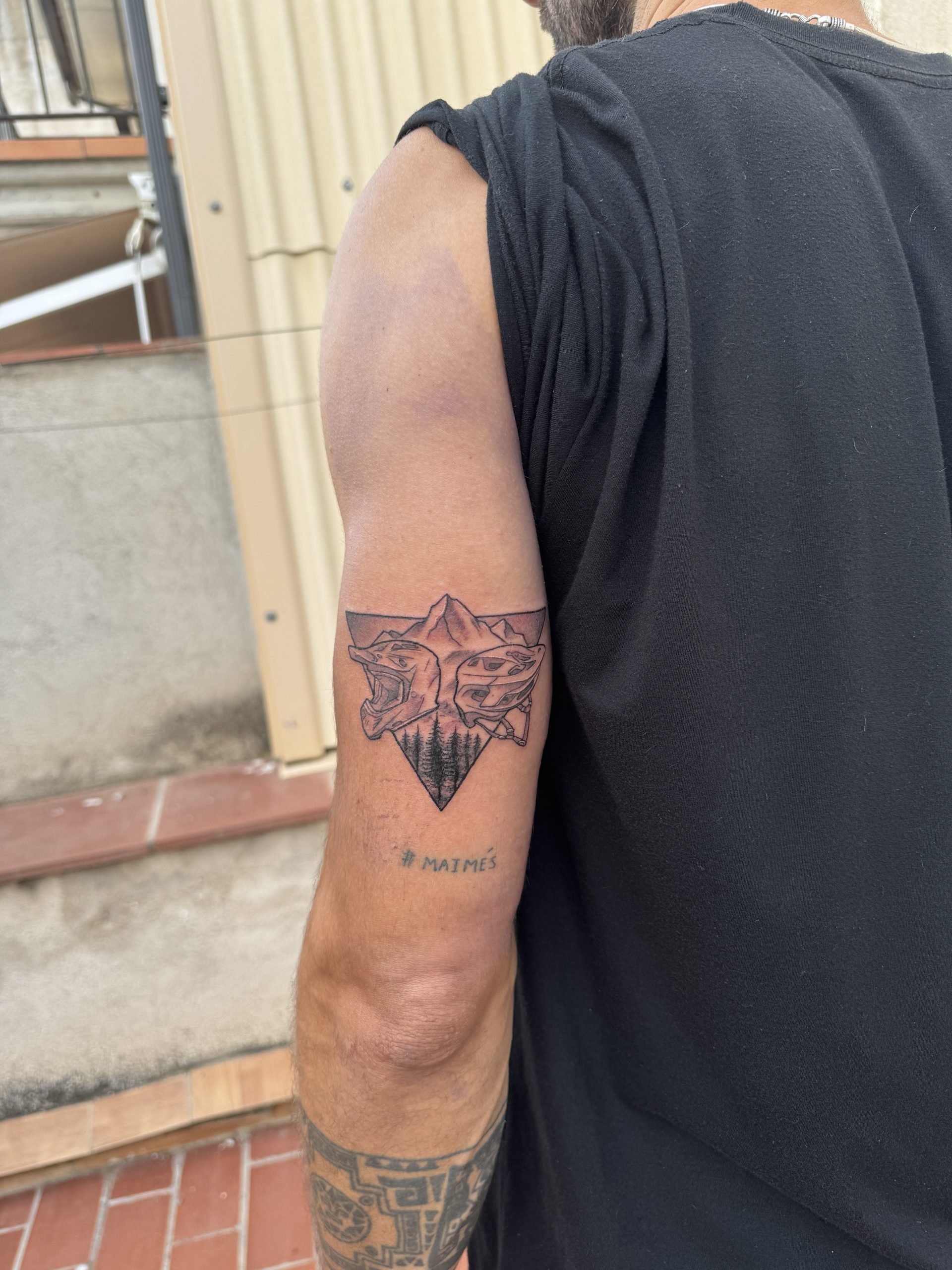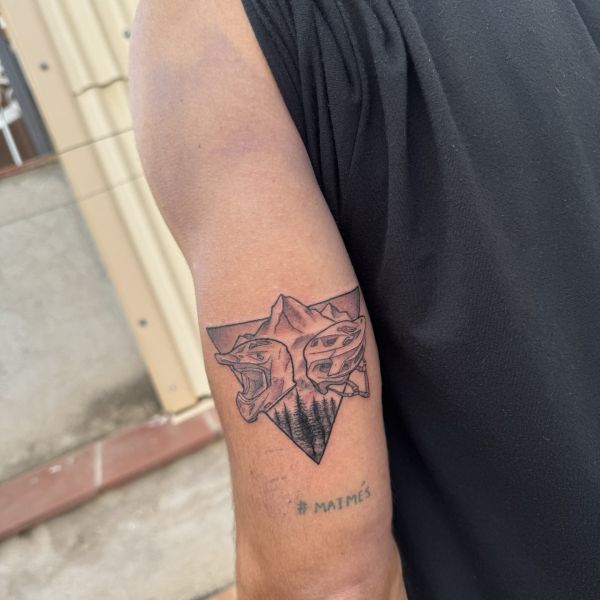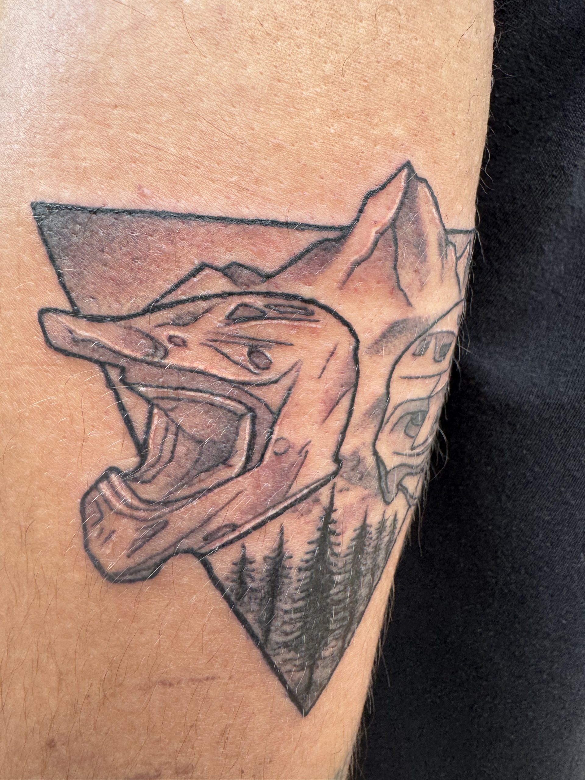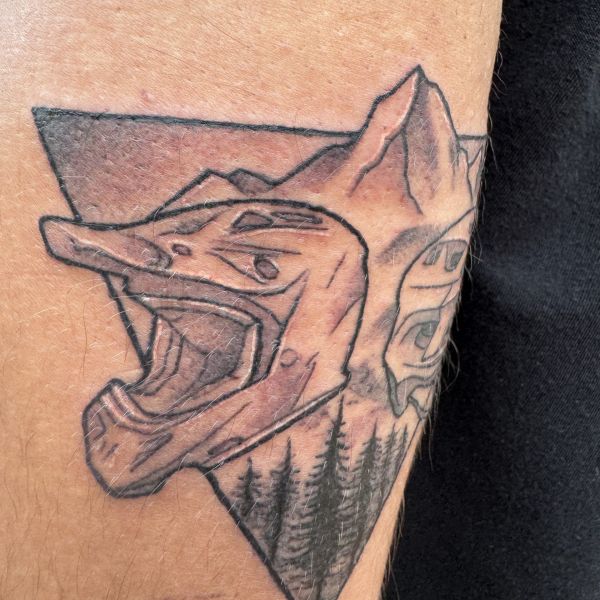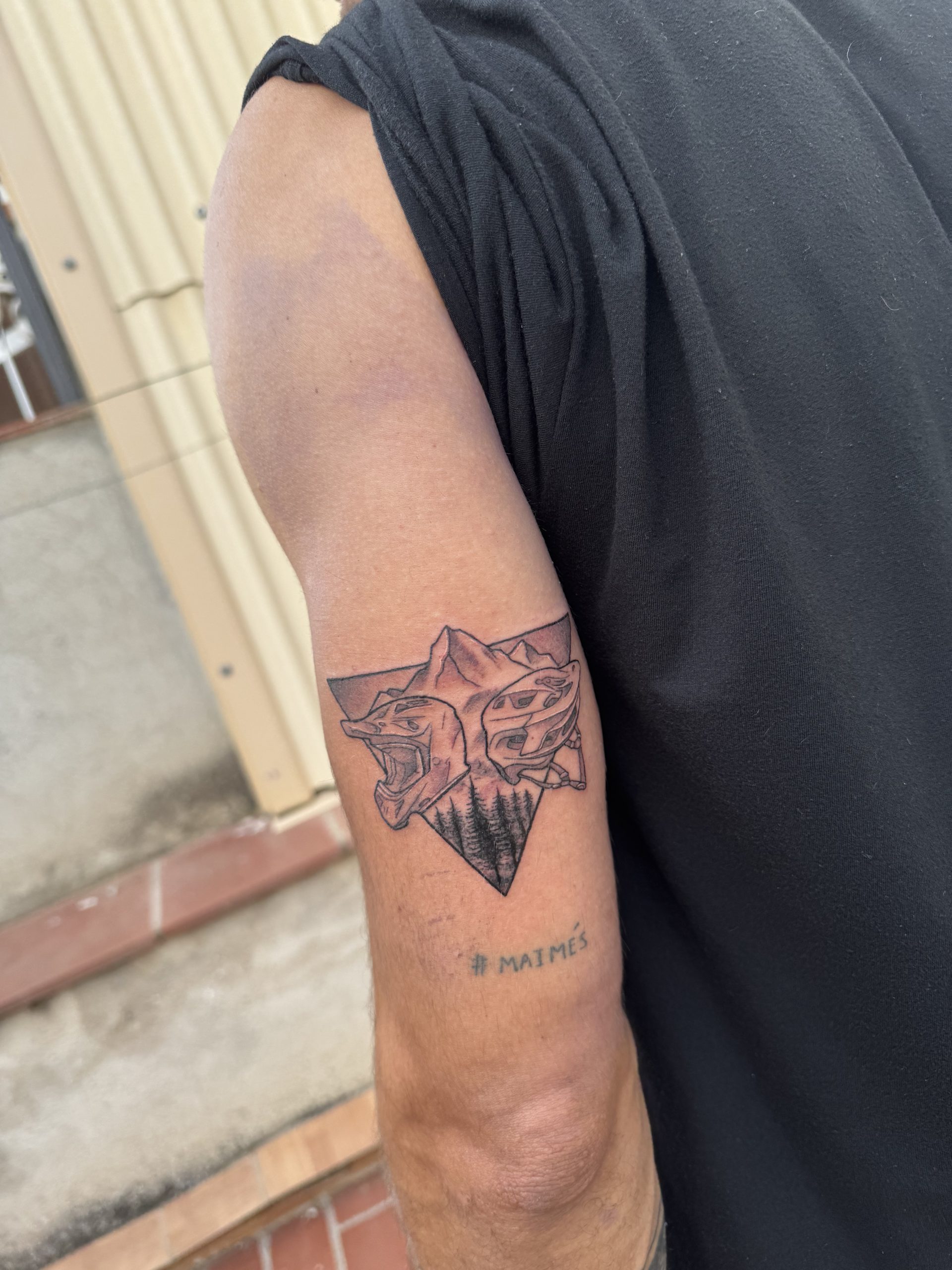 Tatuatge de dues passions unides per la muntanya. Un casc per representar la passió per la bicicleta mtb i l’altre casc per representar la passió per la moto d’enduro. Un tatuatge que plasma l’esperit de naturalesa salvatge, llibertat i esport.