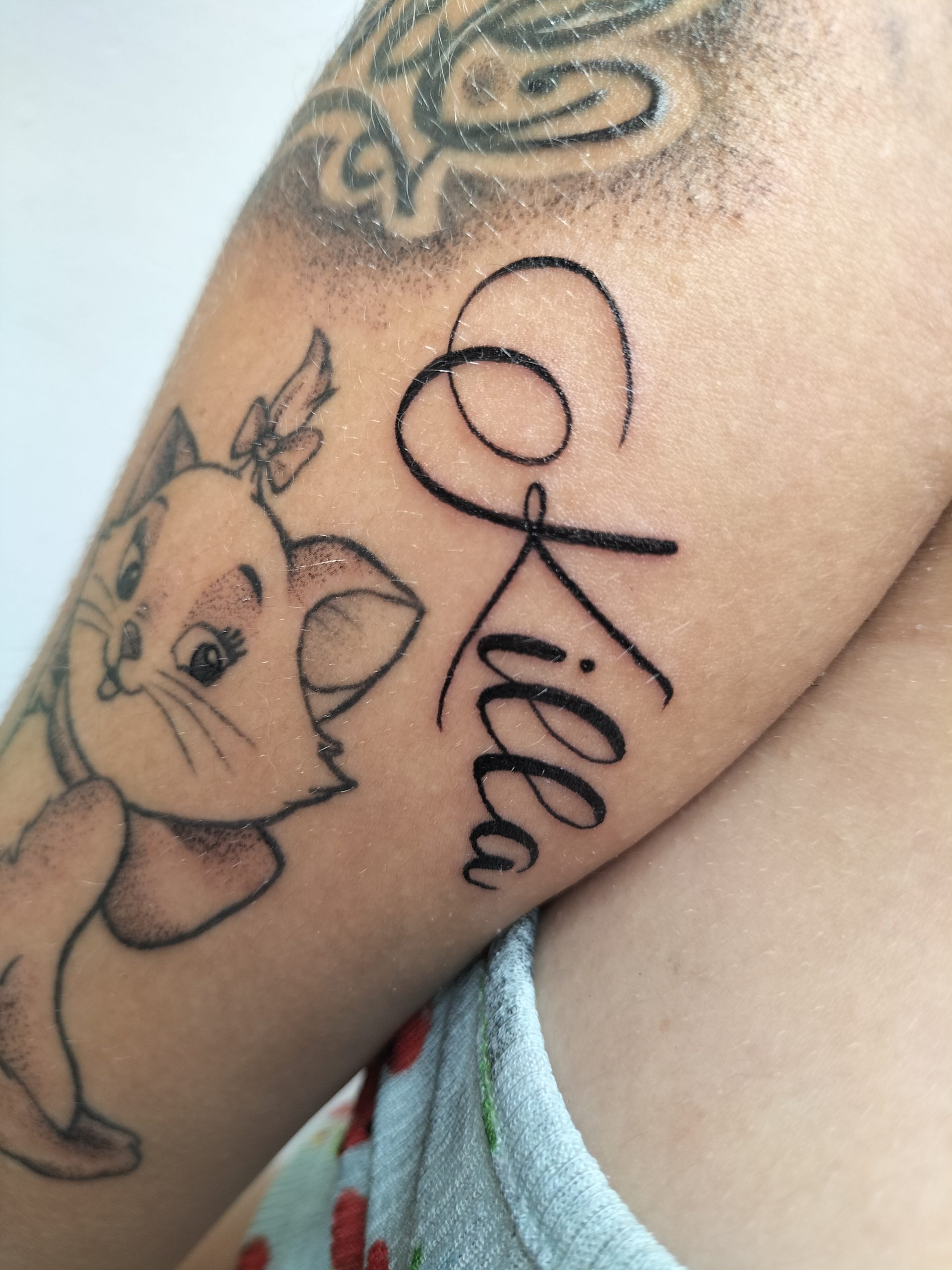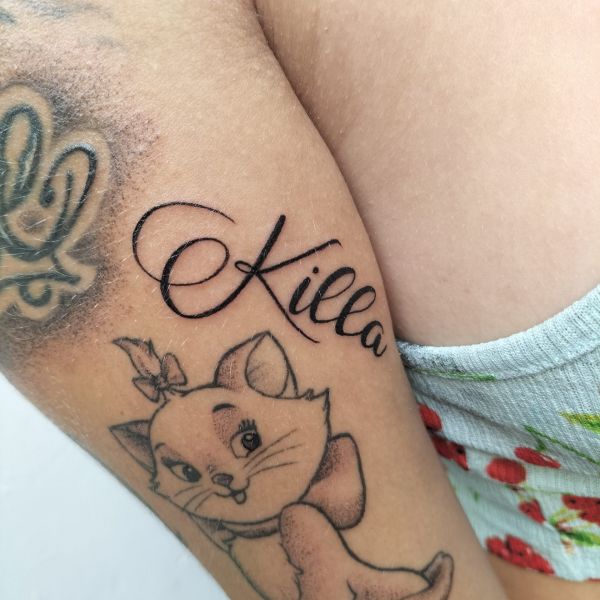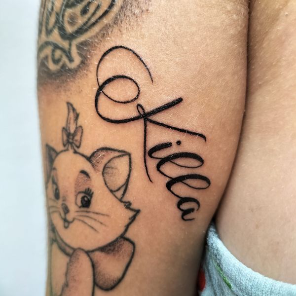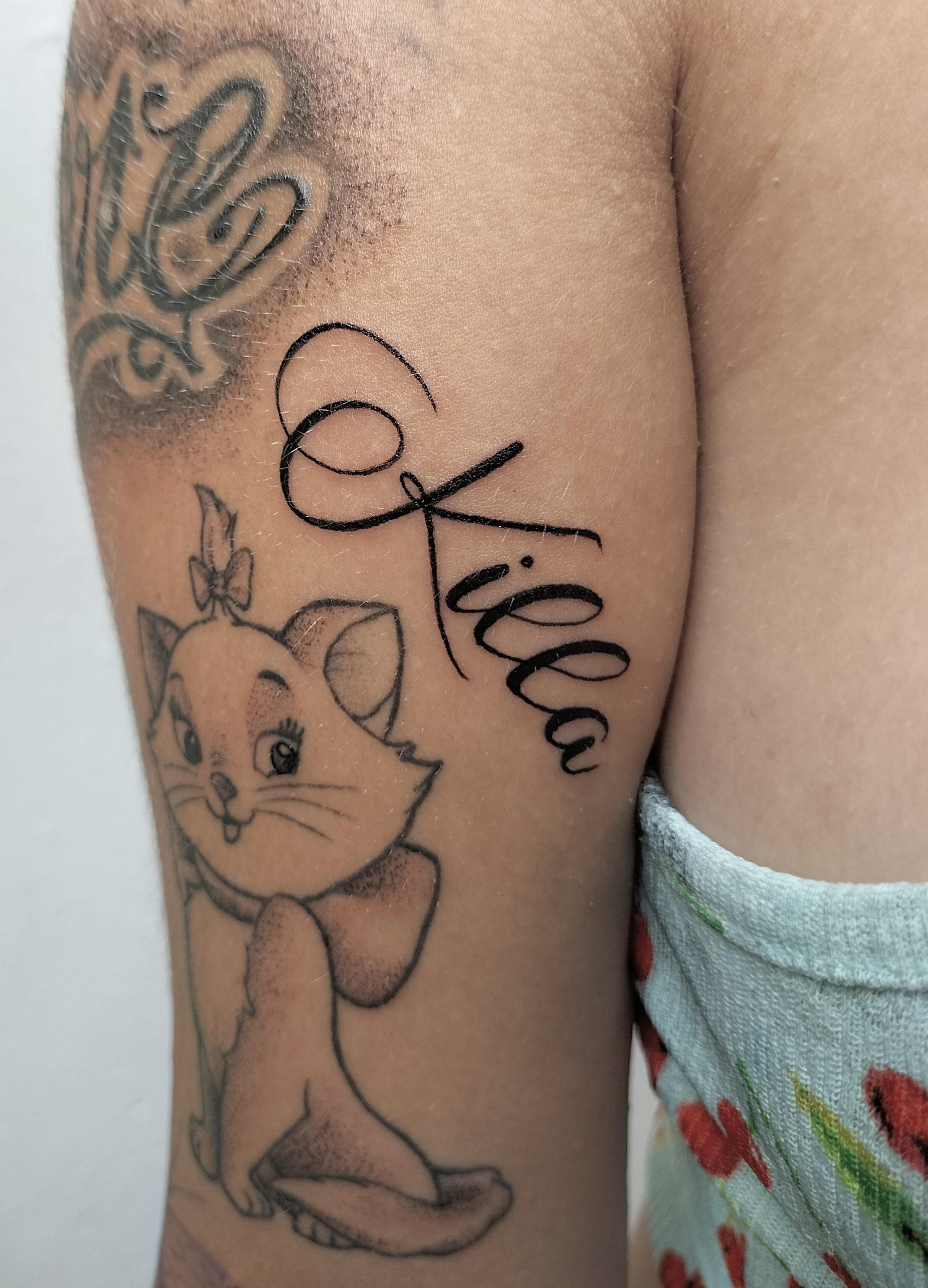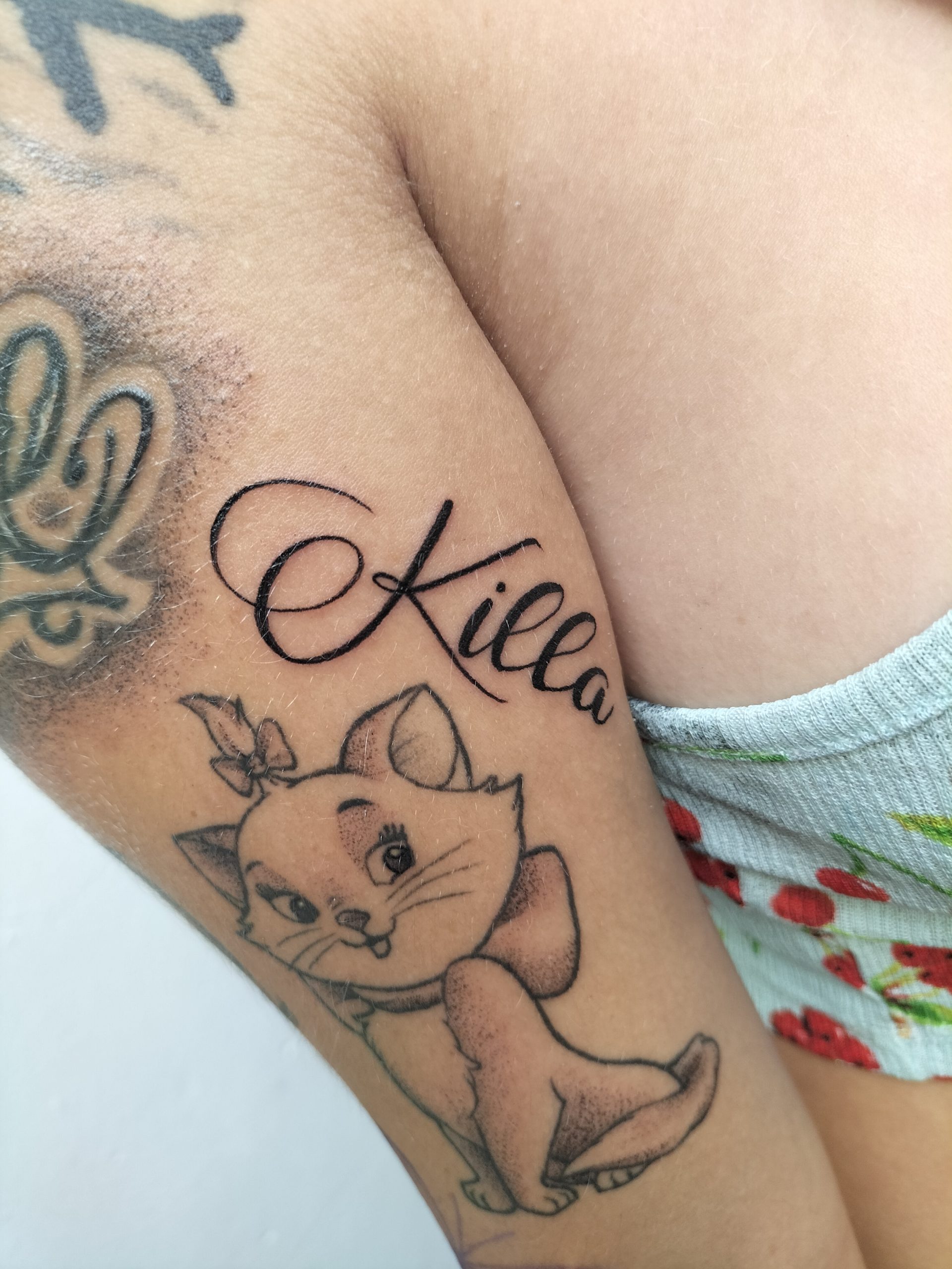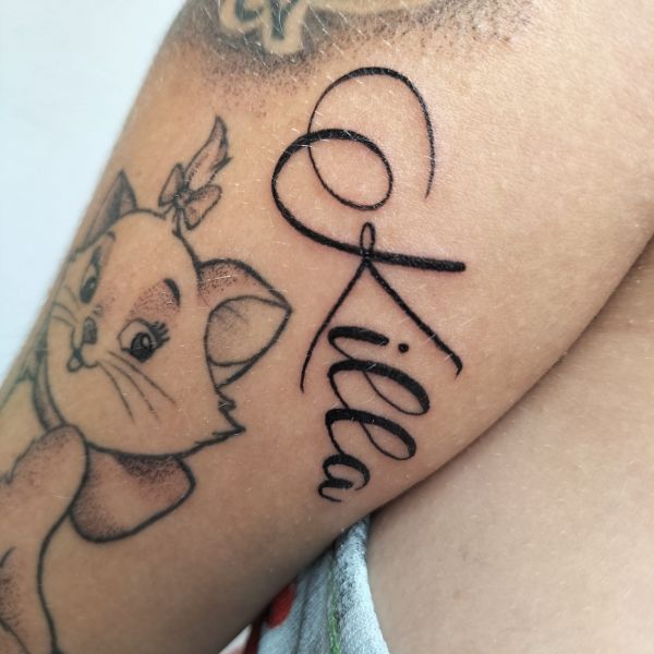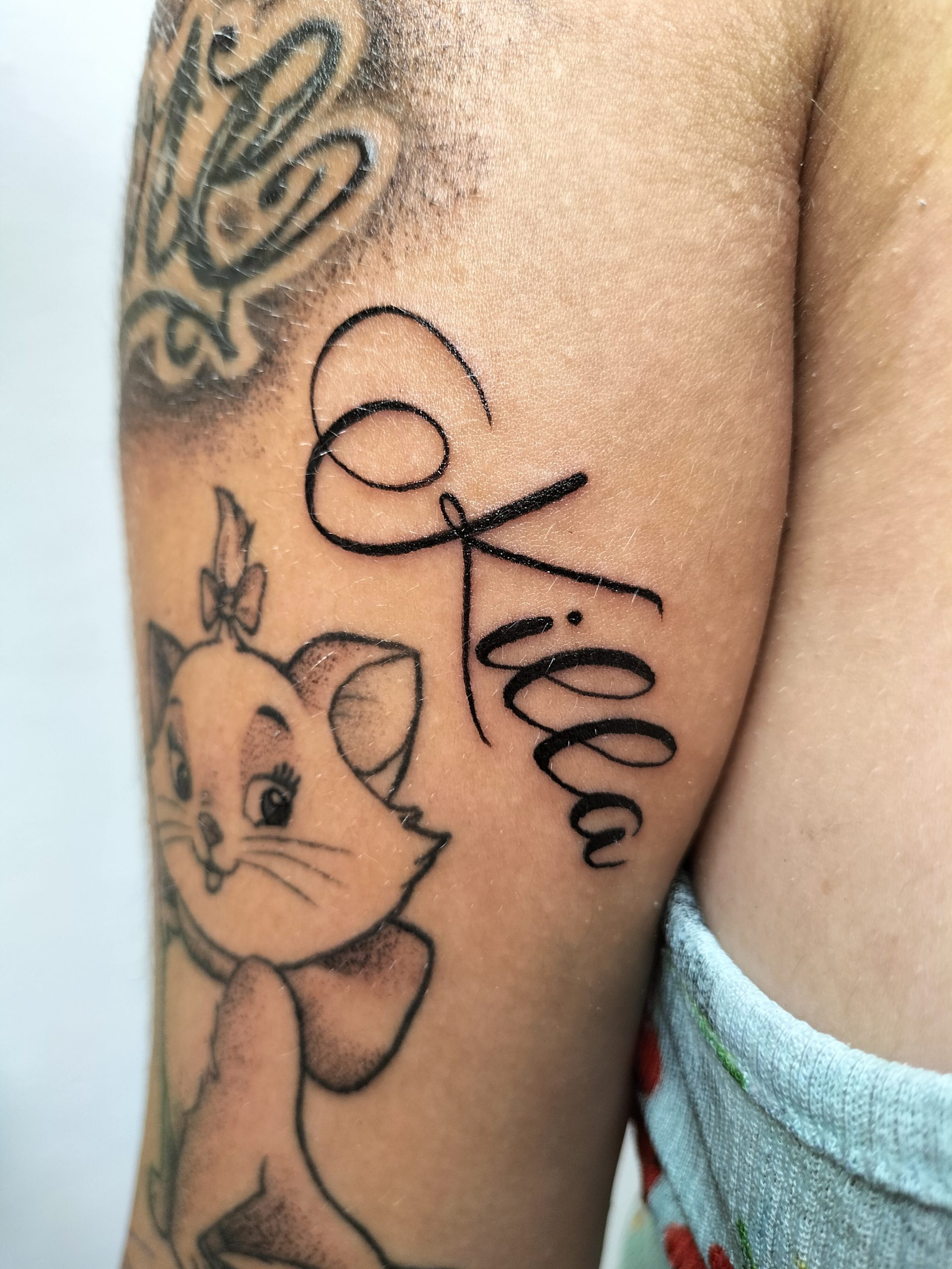 El tatuatge “Killa” està escrit amb una cal·ligrafia elegant i fluida, destacant especialment la lletra inicial “K”, que és gran i ornamental, donant moviment i estil al disseny. La paraula segueix amb traços suaus i corbats, aportant un toc delicat però amb caràcter. Està col·locat de manera vertical al braç, seguint la línia natural del múscul, cosa que en potencia l’harmonia visual. El contrast entre la lletra gruixuda i les línies fines crea un efecte sofisticat.