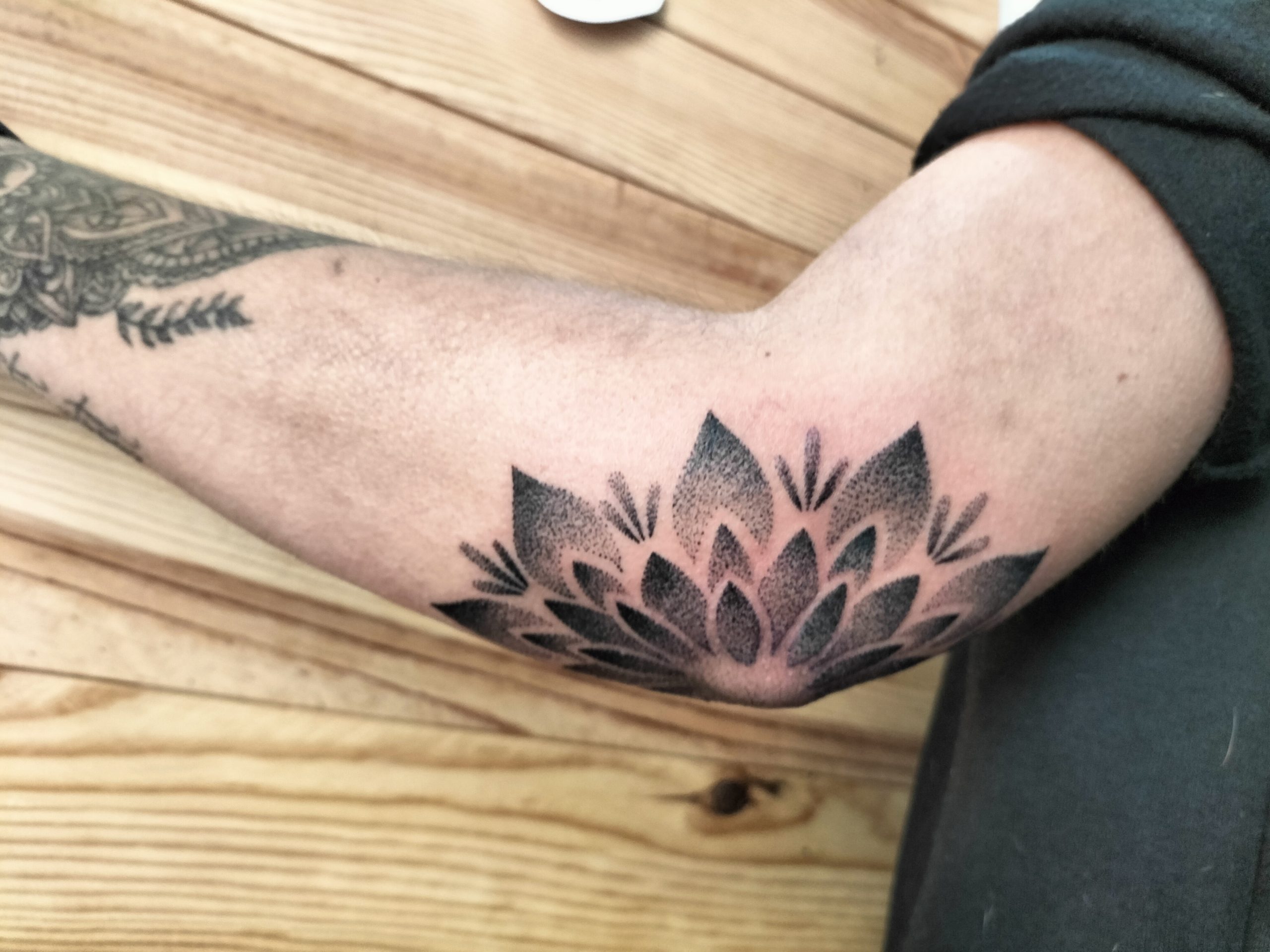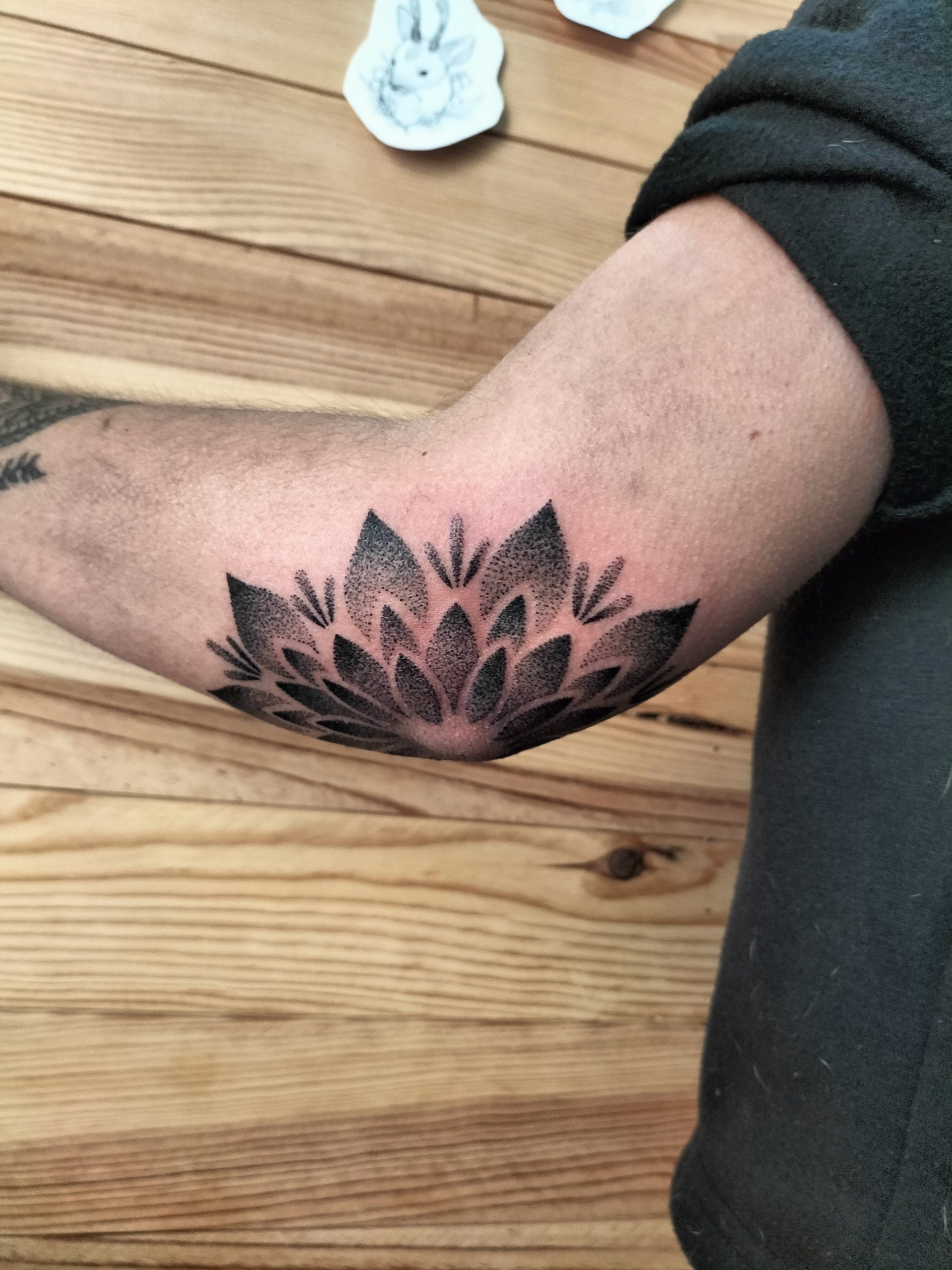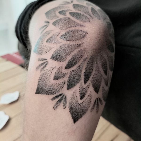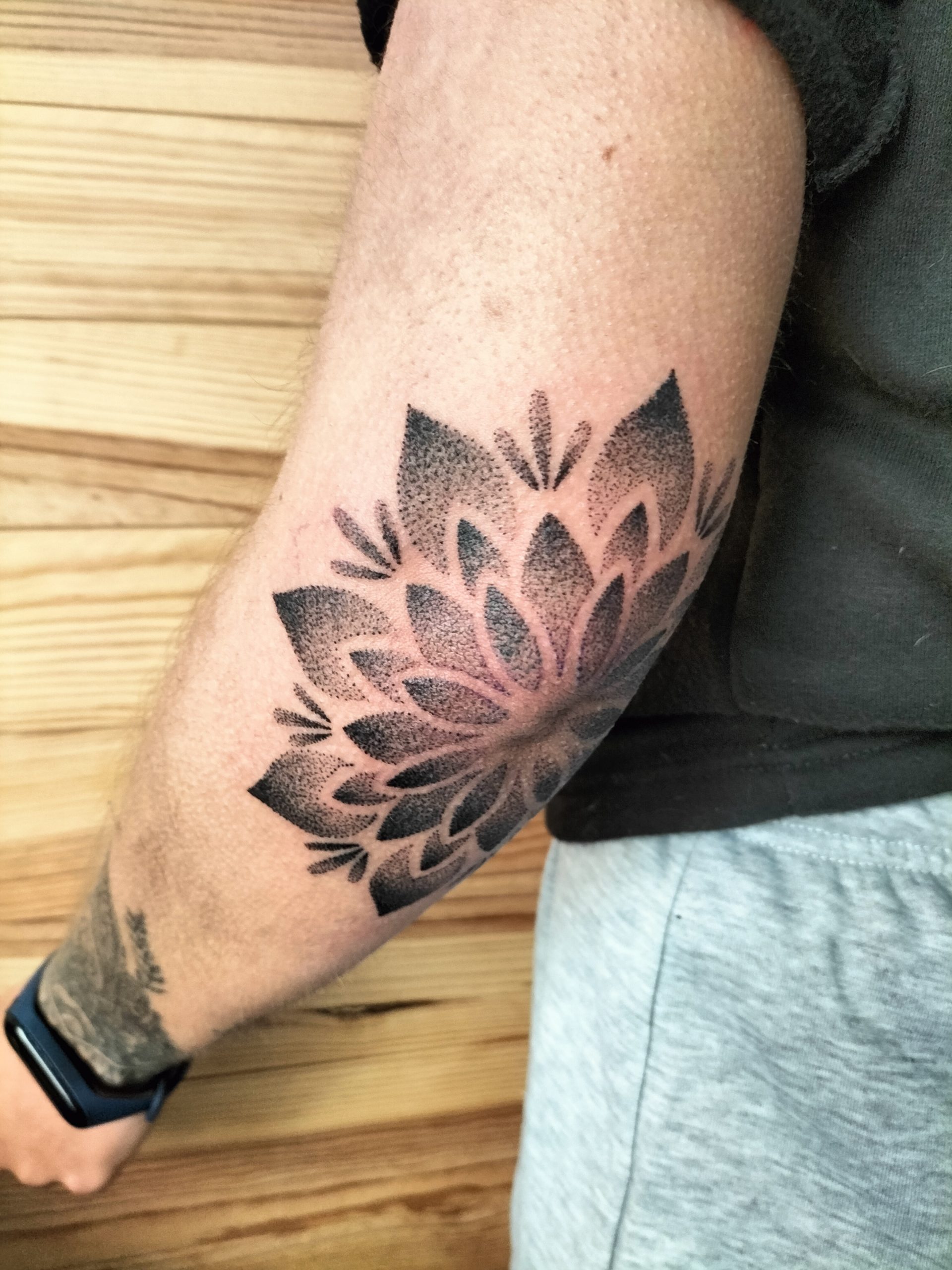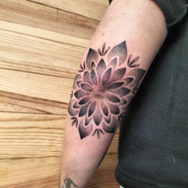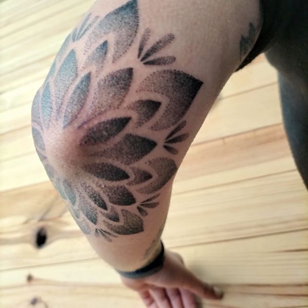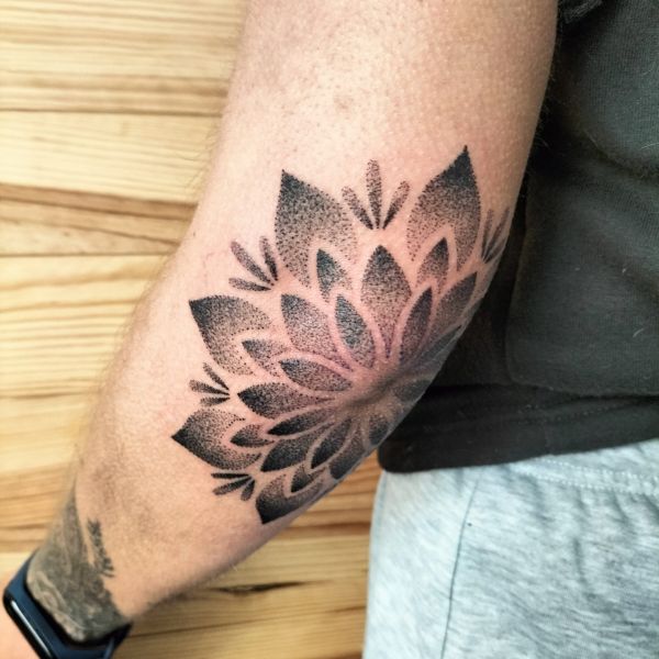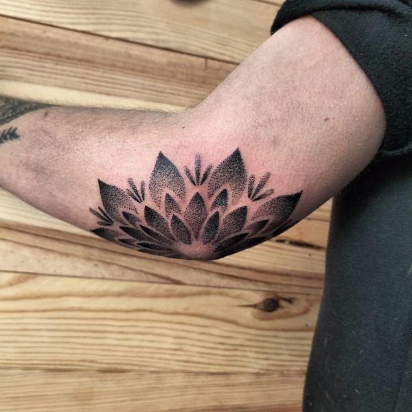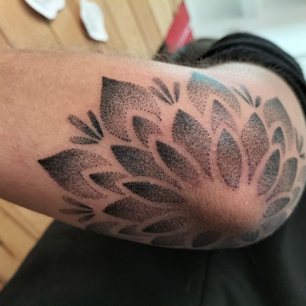 Aquest tatuatge ornamental, situat a la zona del colze, presenta un disseny en forma de flor simètrica estil mandala, format per pètals que es despleguen radialment. Realitzat amb la tècnica de dotwork, el tatuatge combina punts de diferents densitats per crear degradats i profunditat. L’obra encaixa perfectament amb l’anatomia del colze, fusionant estètica i estructura corporal amb una composició visualment potent i equilibrada.