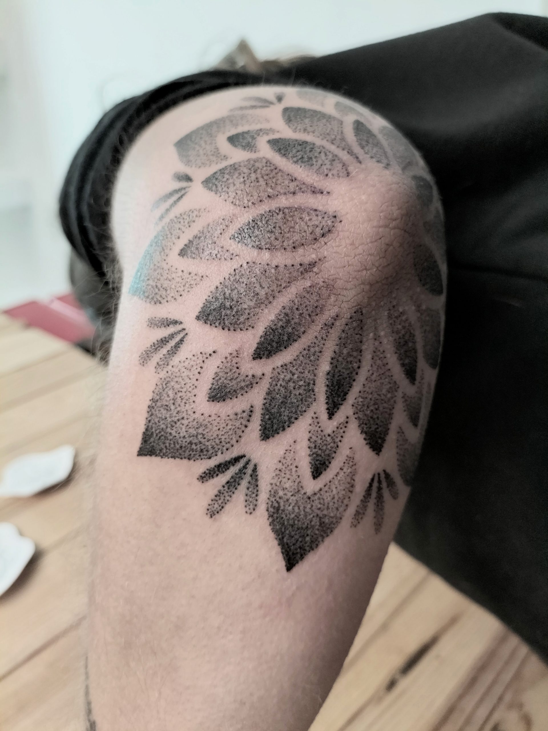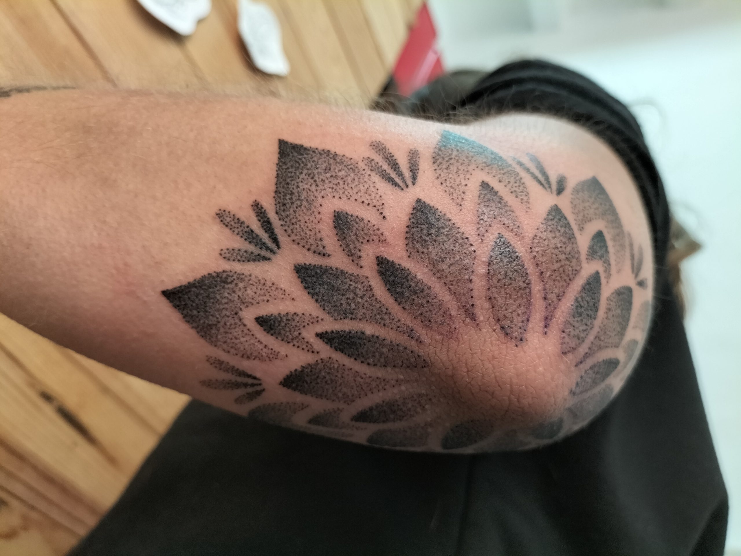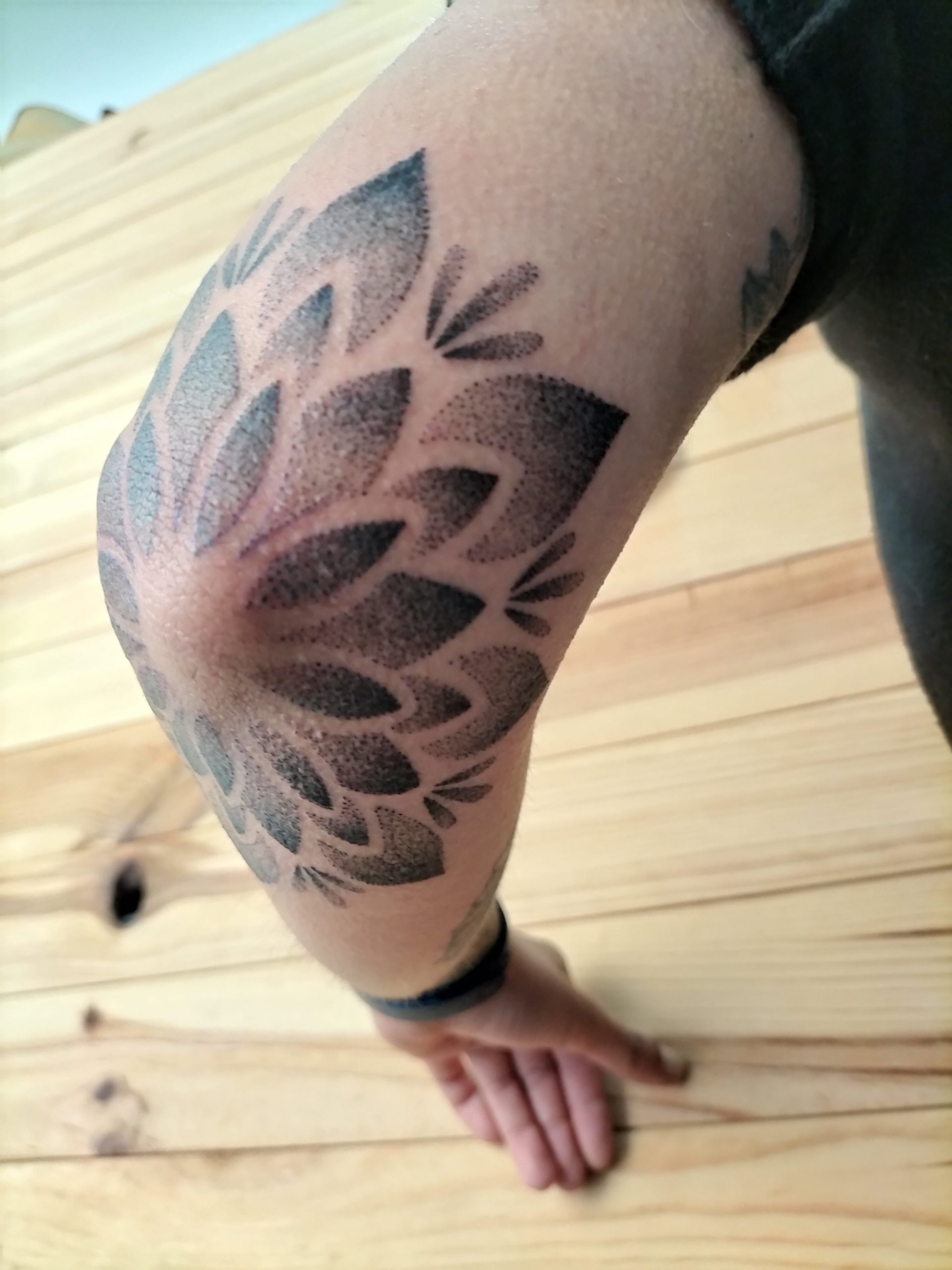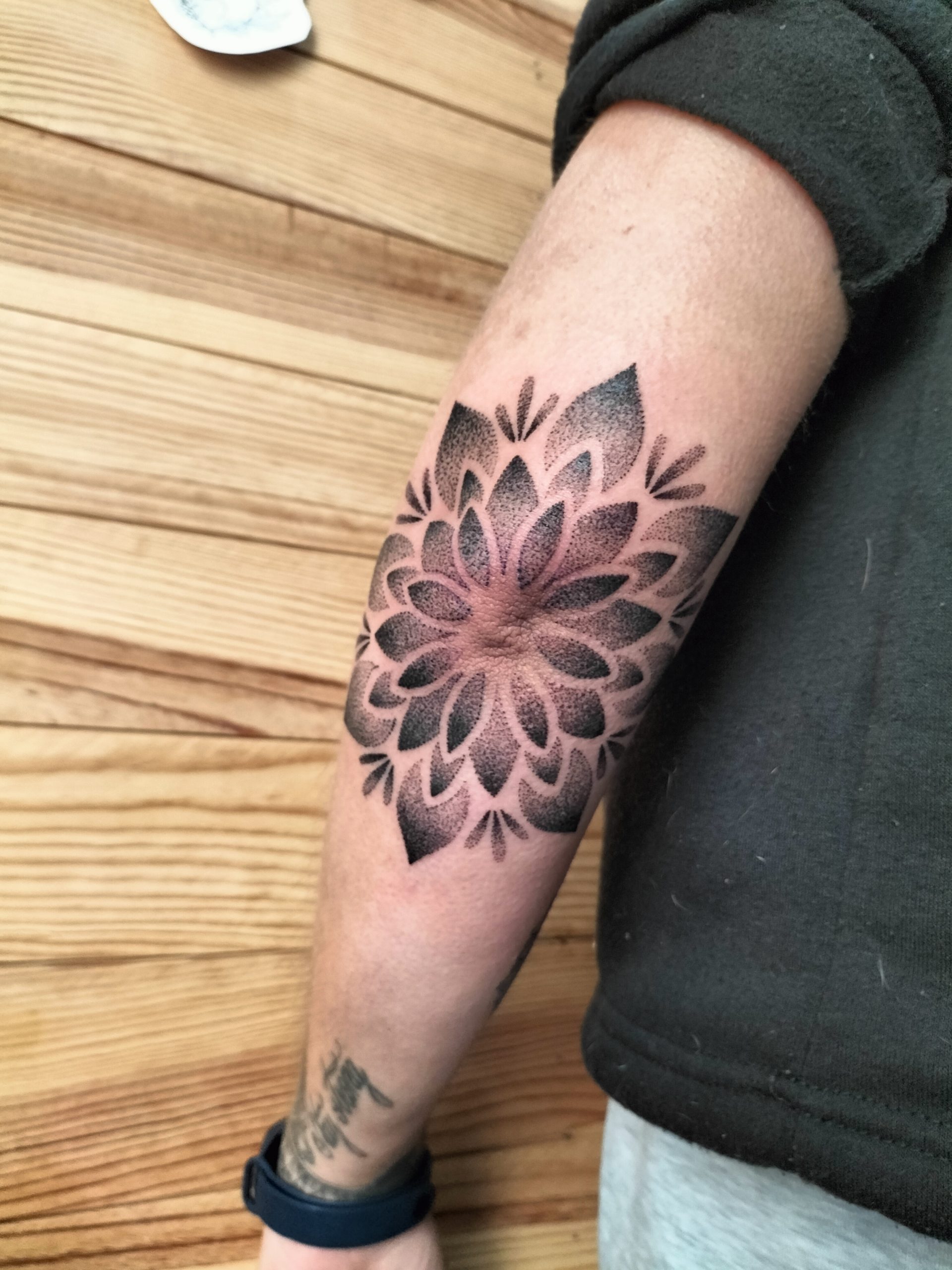 Aquest tatuatge ornamental, situat a la zona del colze, presenta un disseny en forma de flor simètrica estil mandala, format per pètals que es despleguen radialment. Realitzat amb la tècnica de dotwork, el tatuatge combina punts de diferents densitats per crear degradats i profunditat. L’obra encaixa perfectament amb l’anatomia del colze, fusionant estètica i estructura corporal amb una composició visualment potent i equilibrada.